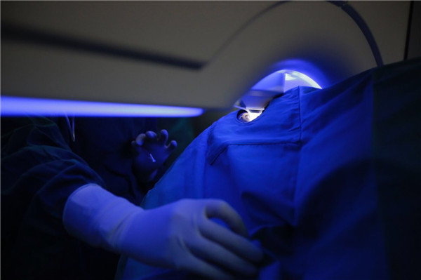 上午10点,手术正式开始。杨桉玉躺上全飞秒手术台,范主任先用开睑器将她的眼睛撑开,然后操作全飞秒激光仪器,让眼睛慢慢接触到负压环,接下来是眼角膜的激光扫描,并对透镜进行切削。手术进程中,范主任一边在操作时,还用特别温柔的声音在引导杨桉玉配合手术。