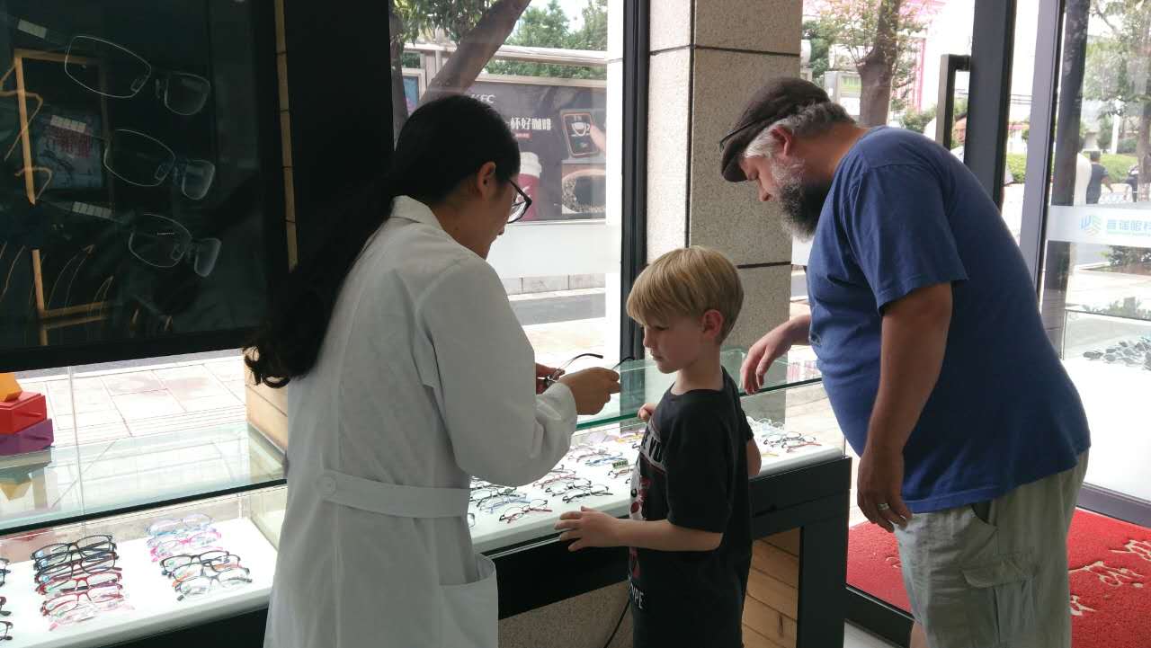 第二天,Asher爸爸带着他和两个姐妹,到医院复查,Asher眼睛患有弱视加远视,必须尽早矫正,验光师细致地给小Asher调试眼镜度数,Asher爸爸说他的中文也不是太好,验光师为了更有效的给Asher测量验光度数,配出一副适合的眼镜,特意在手机上下载了翻译的APP,方便和Asher和他爸爸交流。